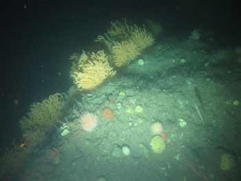 The soft coral Primnoa resedaeformis, seen here upper left, is most common at the inshore sites (Mt. Desert Rock and Outer Schoodic Ridge), while Paramuricea placomus is more common in the offshore basin sites, although it is found inshore as well. Photo courtesy of Peter Auster, University of Connecticut