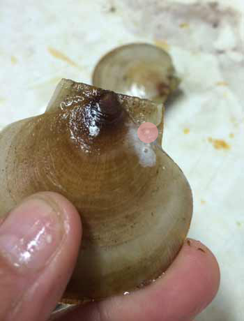 On the bottom shell of the scallop is the ‘byssal notch,’ and this is the proper position to drill a hole in the upper shell.