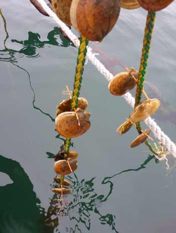 A line of scallops; drilled, pinned through drilled holes in the shells and ropes, and hung for grow-out on the Damariscotta River, Maine. Scallops grow on these lines for 12 to 24 months. They are cleaned by machine annually.