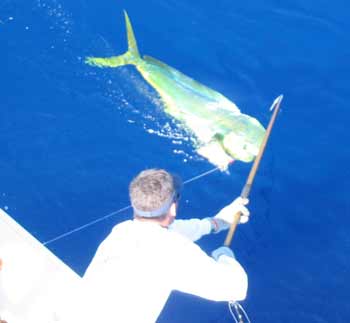“Wham!!” Port outrigger lets go and line streams it’s way out. Mario’s fish and Den’s are both near gaff zone. Manuel goes for the gaff as Mario, still on the bridge, works his fish alongside. Mahi decides he’d be as bull headed as he looks. Uncooperates. Not an easy drill to work a fish, keep it away from other lines, hold it off the side and away from props all the while keeping boat in good location for cockpit fighters. He was doing a magnificent job, while mate Manuel was doing his level best to keep the situation figured out as well.