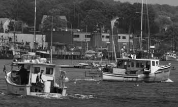 Whether in Gloucester, MA, Friendship, ME, or elsewhere along the East Coast, open stern lobster boats are in evidence. This is the season for off-shore lobstering, rope lengths are longer per trap and generally there are more traps per trawl. A ten trap trawl, for example, is much more easily managed in an open stern boat than in a closed boat. All you have to do is push one trap and the remaining traps slip into the water in turn.