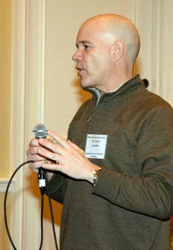 Dr. Jean Lavallee, Aquatic Sciences and Health Services, Canada, speaking at the Forum. “Death by a thousand cuts will start on the boat,” he said. “You’ll get more and more of those stressors and you get the snowball effect, and eventually you get to the point of no return, and that will be your dead lobster.” Mark Haskell photo