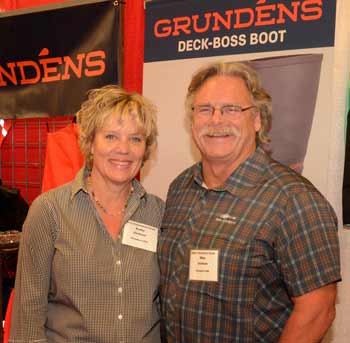 Mike Jackson and wife Kathy at the Maine Fishermen’s Forum in March 2017. Jackson fished offshore in the Bering Sea. He had been overboard more than once and witnessed others go. It led him to promote and sell survival equipment. He was at the Forum representing the company he founded with his brother in 1991, Grunden’s USA, where he spoke at a seminar about safety at sea. Mark Haskell photo