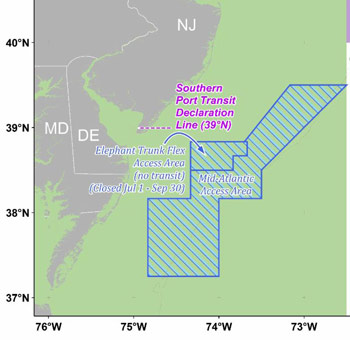 Press Release—NOAA Fisheries announces the closure of the Elephant Trunk Flex Access Area (see map below) to the LAGC IFQ fleet. The scallop regulations require that we close this area once we project that the LAGC IFQ fleet has fished all of the 697 trips allocated to them in this area. As of June 12, 2017, no scallop vessel fishing under LAGC IFQ regulations may fish for, possess, or land scallops in or from the Elephant Trunk Flex Access Area.