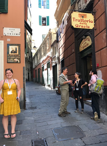 Betsey Brown, left, of Narraguagus High School at Slow Fish in the ancient port city of Genoa, Italy. Betsy helped put on a video workshop conducted in three languages for the international delegates. Paul Molyneaux photo