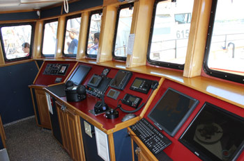 Wheelhouse on the ca. 100-foot scallop dragger FV Alaska at New Bedford, MA. Typical array of marine electronics on a modern fishing vessel. Multiple navigation, communication and systems monitoring devices and screens are on at all times. Additional electronics are below in quarters, galley, on the wheelhouse and masts. Fishermen’s Voice photo