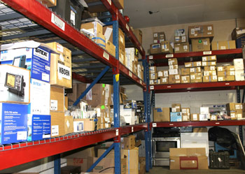Chris Electronics on-site warehouse. Fully stocked with everything from radar to fish finders with reels of wire to draws of connectors and fasteners and masts to computers. The modern fishing vessel is fully wired with a network of electronics. Fishermen’s Voice photo