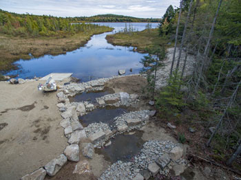 Pierce Pond, Penobscot, Maine. Engineered anadromous fish passage to Pierce Pond. Many of the thousands of ancient routes for alewives and other anadromous fish in Maine have been blocked by human activity in the form of dams, roads, unmaintained culverts and debris. The fish that annually swim up into estuaries, streams and lakes to spawn produce the trillions of young fish that return to the Gulf of Maine. They become the base of the food chain for life in the Gulf of Maine. Ken Woisand photo