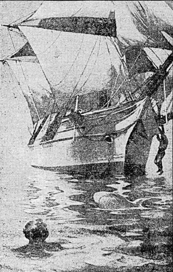 There, they found a bizarre scene. Sails were tattered, with some missing altogether. Rigging was likewise damaged. Ropes hung over the ship’s sides. The main hatch was tightly covered, but the fore and lazarette hatches were open, with their covers nearby, on the deck. The hold contained about 3 ½ feet of water, somewhat more than might normally be found.