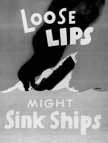 World War II poster urging confidentiality regarding coastal shipping. German submarines were sinking so many merchant ships along the Atlantic coast of the U.S. that black outs, no night lights along shore, were in effect and conversations regarding shipping restricted. More than 400 merchant ships headed for Europe we’re sunk by subs off U.S. Atlantic coast in 1942.