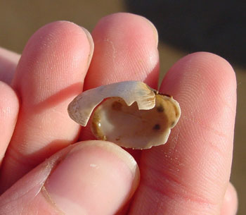 Clam from the Rim River damaged by green crab. Sarah Dedmon photo