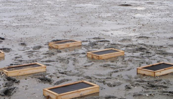 Recruitment boxes at Collins Cove, Freeport, ME. Boxes measure 1 foot x 2 feet, set out on clam flats. Mesh on top prevents green crabs from entering. DEI photo