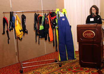 Rebecca Weil from the Northeast Center for Occupational Safety and Health and John McMillan of McMillan Offshore Survival Training presented several versions of new PFD designs. Weil has been involved with a program to engage fishermen in the design and experimental use of PFDs in New England. McMillan is a 20-year veteran of offshore survival and marine safety training.