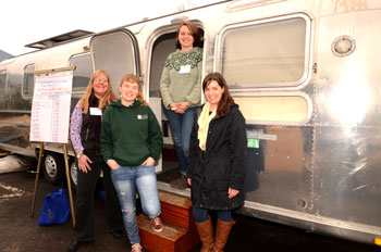 At the door of the 31' Airstream trailer mobile studio for The First Coast project, from left: Natalie Springuel (Maine Sea Grant), Teagan White (College of the Atlantic), Galen Koch, and Rebecca Clark Uchenna (Island Institute). The trailer will be in coastal Maine communities where year round Maine residents can tell their stories. Mark Haskell photo