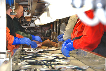 Scientists sorting fish on a conveyor belt aboard the research vessel Bigelow. NOAA photo.
