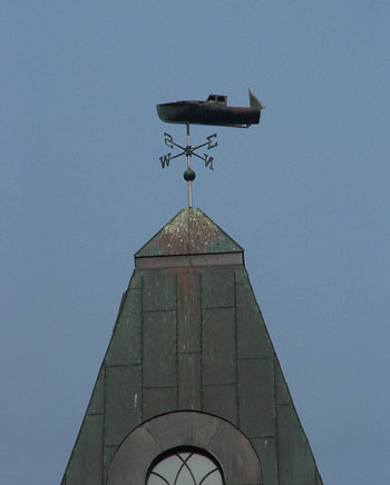 The company that lobster traps built. Out of appeciation for the lobster industry, this weather vane was built for the top of the former clock tower of the 1840 mill in Northbridge, Massachusetts. Scythes were originally made there, before the plowshares to swords shift for the Civil War in the 1860s, when it became a bayonet factory. It returned more to it’s roots in 1979 when Riverdale Mills rebuilt it for a lobster trap wire mesh factory. Fishermen’s Voice photo.