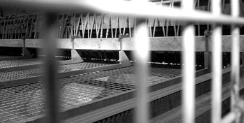 Today a larger machine runs giant spools of this 1/4’ wire, joined into a continuous length, though dies, sending the thinner wire onto spools and then on to the welder. A major turning point in the production line was the purchase, in 1979, of an Austrian, custom built, computer driven welding machine. This welder welds, simultaneously, all 81 intersections of a line wire (length) with a cross wire in typical, 1 1/2”inch square mesh that is 10 feet wide. It operates like a press, with an -foot long narrow bar coming down on the intersecting wires stretched on a metal bed. An electric charge welds all the intersections at once. All day long this welder pours out ribbons of welded mesh. It is then machine cut to specified widths and rolled up.