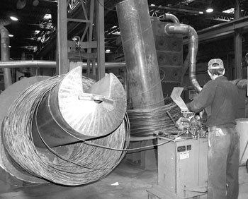Giant spools of 1/4" wire are welded end to end to form a continuous length feed into the machinery. The wire is stretched to 1/3 its diameter forming miles of wire that goes to spools, welders, machine cutters, zinc coaters, plastic coaters, and packers before being shipped to lobster trap builders. Fishermen’s Voice photo.