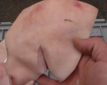 Typical piece of pig hide bait. The hide is salted to preserve it. The pieces remain pliable and can be easily cut with a knife.