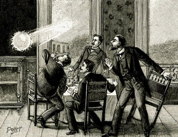 19th century illustration of diners being startled by ball lightning.