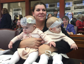 Augusta, Maine, December 6, 2018, Maine State Representative Genevieve McDonald with her twin daughters at the state house in Augusta on the legislator’s first day in office. Democratic Rep. McDonald represents District 134 in the heart of Maine’s commercial fishing industry. A woman of firsts, the first woman commercial fisherman elected to the State House submitted her first bill on her first day, “An Act to Encourage Youth Participation in the Maine Lobster Fishery.”