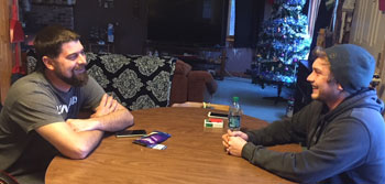Josh Kelley, left, and sternman Phillip Kilton well positioned back on dry land in Beals, Maine. The pair narrowly escaped their sinking lobster boat miles off Beals Island on November 25, 2018 after following U.S. Coast Guard safety protocols. Josh Kelley photo.
