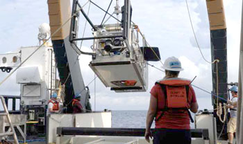 NOAA Press Release—Northeast Fisheries Science Center and Woods Hole Oceanographic Institution researchers partnered to develop and test a new instrument called Deep-See. We will use this 2,000 pound, 20-foot long instrument will explore an area of the open ocean just off the edge of the continental shelf known as the Twilight Zone, where light from the surface stops penetrating. Deep-See was built with a grant to WHOI from the National Science Foundation, and the Northeast Fisheries Science Center helped develop the project and provided the ship-time for the testing and evaluation.