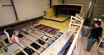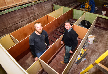 Gleason Smith left, Team Leader, and Stewart Workman working on fuel tank areas in a 44' Calvin Beal. Photo includes area of the bilge structure, fuel tank and fish hold compartments. Kelli Park photos.