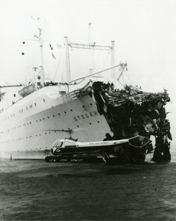 A helicopter hovers close to the damaged bow of the Swedish liner Stockholm as the vessel limps into New York Harbor, July 27, 1956. The ship collided with the Andrea Doria two days earlier 45 miles southeast of Nantucket Island, MA. USCG photo.
