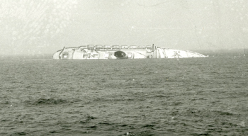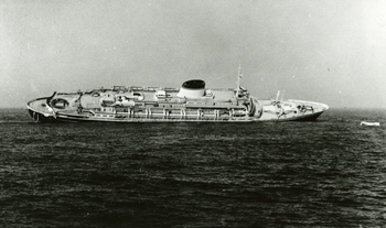 Rolling to starboard as the “watertight” compartments filled with water. Port life boats securely in place for the ride down. Many survivors spent the night in life boats in thick fog. USCG photo.