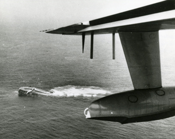 The last act in the sinking of Andrea Doria occurred at 10:09 a.m. on July 26, 1956. Just before going stern up when the ship dove to the bottom. Coast Guard sea plane in the foreground circling the event below. USCG photo.