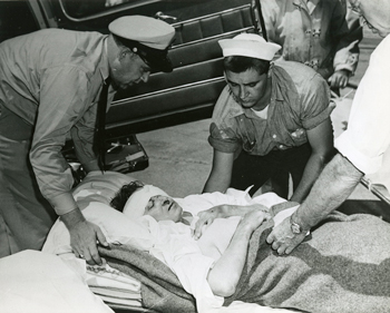 Logan Airport, Boston. Patient one of the injured in the collision being transported to the U.S. Public Health Service Hospital in Brighton, MA. USCG photo.