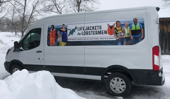 One of the two vans that will provide lifejacket options at a one-time discount in Maine and Massachusetts ports. Fishermen will be allowed to try them on and get information about the various options.