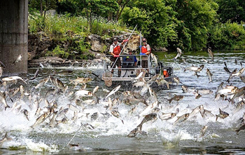 School of Asian carp leaping out of the water. Asian carp grow to 39 to 40 inches long and 40 to 50 lbs. They were introduced into the U.S. by fish farmers in the southern states in the 1960s and 70s to control vegetation and algae blooms. Five species of asian carp have been released or escaped and are breeding in the Mississippi Basin. They are expanding their range. The US Fish & Wildlife Service is concerned that they will breach a narrow barrier in Illinois and enter the Great Lakes. Efforts are under way to attempt to control their expansion. Photo courtesy Ryan Hagerty/U.S. Fish & Wildlife Service.