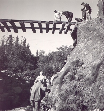 On September 12, 1954, Hurricane Edna struck New England killing eight people. After the storm, sagging and unsupported ties were common sights throughout the Bangor and Aroostook railroad system. Train service was virtually non-existent the first 48 hours after the storm. Track forces were quickly mobilized and work begun on the 157 washouts caused by the storm. Photo: Collection of Oakfield Historical Society.