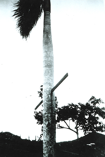 Palm tree punctured by a 2x4 illustrates the force of high winds from hurricane Andrew. Photos from collections Oakfield Historical Society.