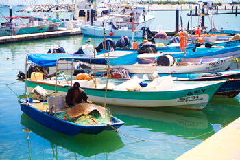 Inshore fishing boats tied up at municipal wharf in Mazatlan, Mexico.