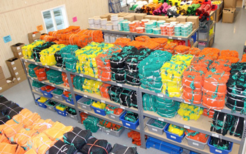 In their old store they had 8 to 10 coils of each rope variety on the floor. In the rope room of the new store there is more space for larger piles. There are 30 coils of many of the varieties, for example, of 3/8” Esterpro on the floor in the store. Over in the warehouse the entire first floor is packed with over 5,000 coils of rope – 92 varieties of different brands, sizes and colors. Polysteel Atlantic’s ropes are brought in by the tractor trailer load. “A tractor trailer load of 44,000 lbs. of rope, the most the trucks can carry, requires a lot of space. Our new location has the space to make that happen,” said Holmquist. The company has 4 fork lifts, 4 box trucks and pallet trucks that keep all this inventory in motion.