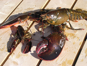 A 1 1/2 lb. lobster and an old large 15 lb. male lobster. A female would have smaller claws and a larger abdomen (tail). Diane Cowan photo.