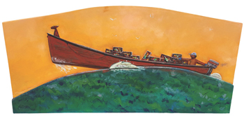 Phil Barter has been painting Maine for 60 years. Barter has at the same time had marine occupations in Maine, including fishing. He knows well many of the places and people in his paintings. Over the decades Barter has developed imagery that is distinctively his own. The people and places depicted in this Franklin, Maine native’s work could only have been painted by him. Barter is an original. He doesn’t consider himself a folk artist or a primitive painter.