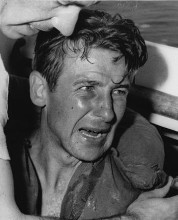 One of only 20 survivors of the U.S. Coast Guard cutter Jackson. This crewman’s face is contorted with pain from multiple stings by Portuguese man o’wars while awaiting rescue in shark infested waters. Rogue waves sank two 125-foot Coast Guard cutters, Jackson and Bedloe, during the Great Atlantic Hurricane in September of 1944 off the coast of North Carolina. Coast Guard photo.