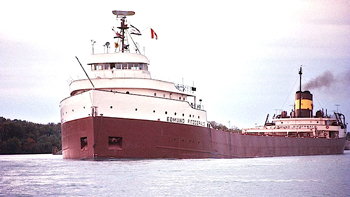 The 729-foot by 75-foot Edmund Fitzgerald in 1971. The largest ship operating on the American Great Lakes. Recent studies have concluded that the ship was swamped by a rogue wave. It broke in half and instantly went to the bottom with its crew of 29 in 350 feet of water.