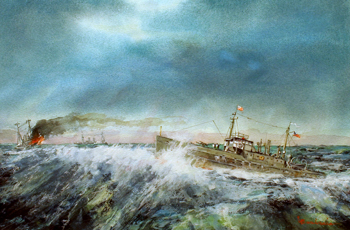 The two doomed vessels had received storm warnings while assessing the status of the Liberty Ship, George Ade, along with the navy oceangoing tug that was towing her. The George Ade had suffered a hit from a German torpedo and was on fire.