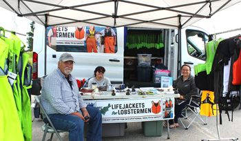 The NCOHS Life Jacket van topped their coastwide goal of 500 units at the Winter Harbor races. Left to right: John McMillan, McMillan Offshore Survival Training, and van drivers Erin Lally and Amanda Roome. Fishermen’s Voice photo.