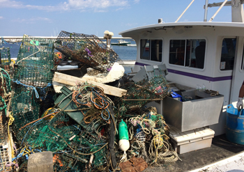 We kneeled in the muck to cut slimy, rotten rope from under wharves with our knives. We pulled hundreds of beverage and bleach bottles out of prickly rugosa rose bushes and rock crevices. We hauled, we picked, we gathered and we stacked old, derelict traps on the wharf. We strained to pull half-buried items out of the wet sand. We loaded all manner of stuff onto trucks if there was anywhere to park a truck, and made piles in some of the coves for collection by skiff where there was no road access.