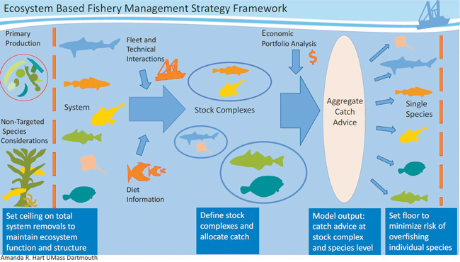 This graphic depicts the complexity of Ecosystem-Based Fishery Management. Graphic courtesy of New England Fishery Management Council. Graphic by Amanda R. Hart, UMass Dartmouth.