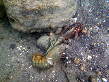 After escaping from the old exoskeleton, the freshly-molted lobster buries its old shell. In the case of this photo, the lobster lived under a rock (top of photo) not roomy enough for shedding, so he shed out in the open, attempted to bury his old shell, and then scurried back under his rock to hide. He would return to begin eating the old shell. Photo by Diane Cowan, Lobster Conservancy Cove (former lobster pound) in Friendship, Maine.