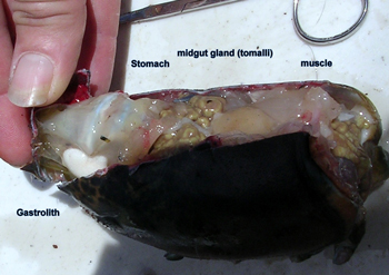 A window of exoskeleton at the dorsal (back) surface of the lobster removed to show what lies underneath the top of a lobster that is just about to shed. Claws, other limbs, and abdomen have been removed. The anteriormost structure is the stomach shown exposed at the front of the “head” region. Some call this the mermaid’s purse. Gastrolith (white) on left side of stomach (there’s another on right side not shown), midgut gland (tomalli), and muscle tissue also labeled. The gastrolith is a calcium reserve only available for the molt period.