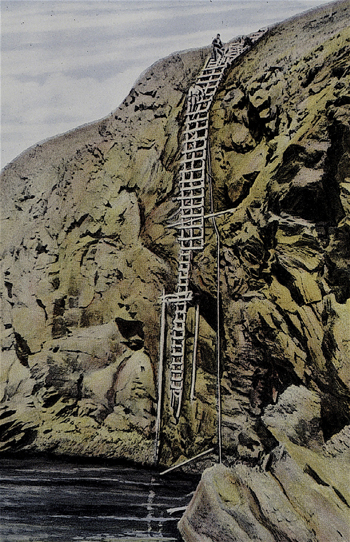 To read the tide gauge at Cape Mordvinof on Unimak Island, Alaska, in 1939, scientists had to descend a 60-foot ladder suspended by wires and stakes. Photo from NOAA Photo Library.