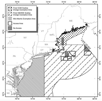 NOAA Fisheries has expanded the boundaries of the current Great South Channel and Southern New England Scallop Dredge Exemption Areas for the Limited Access General Category Individual Fishing Quota fishery creating a single area south of 42° 20’ N lat. and east of the Mid-Atlantic Exemption Area. All other Limited Access General Category Individual Fishing Quota regulatory requirements such as the requirement to use dredge gear 10.5 ft or less and possession limits for both scallops and monkfish remain unchanged.